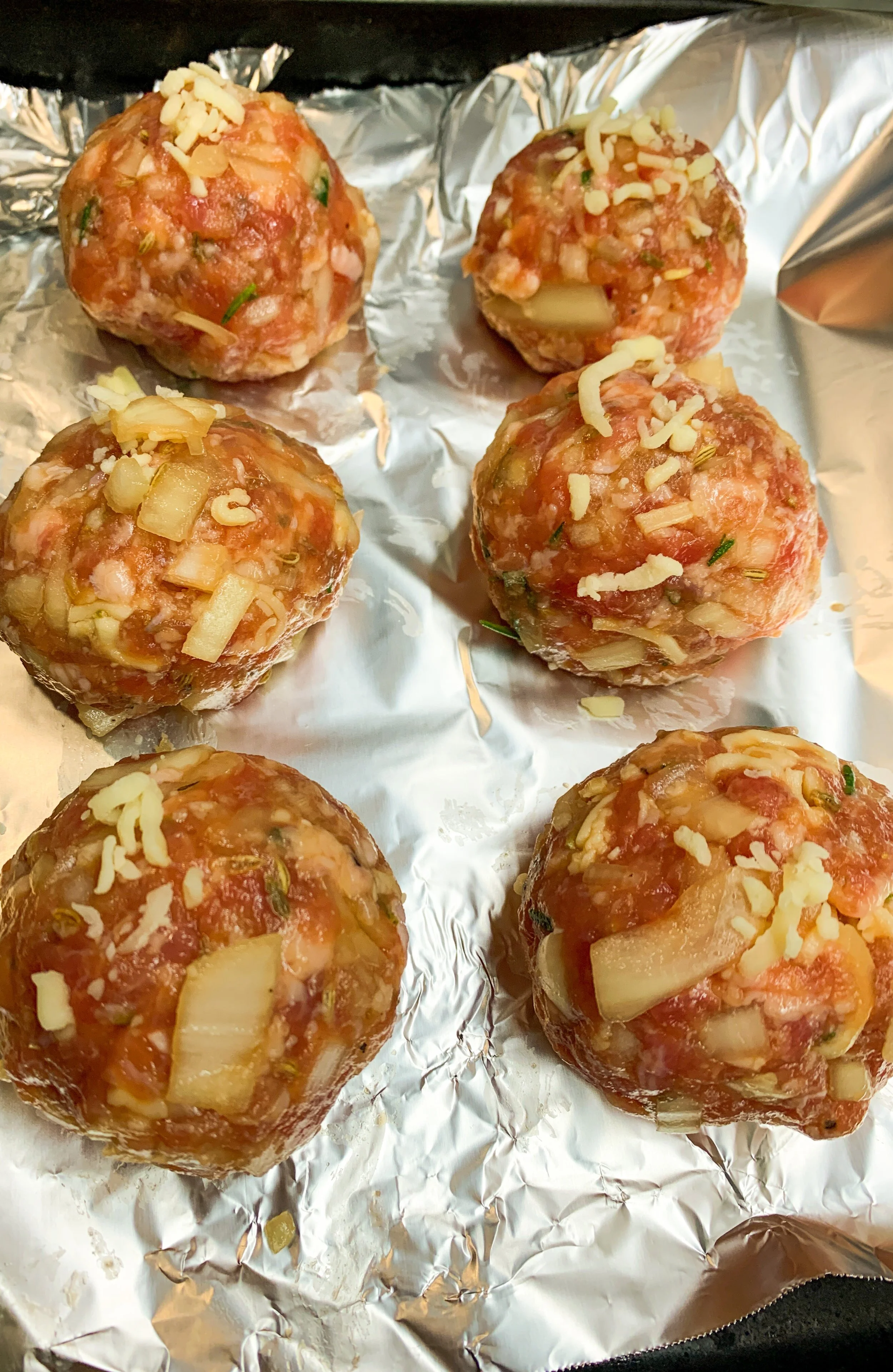 從雪櫃拿出肉碎,先取一部分,搓圓壓扁,放上芝士,然後用豬肉碎覆蓋,用雙手搓成球狀