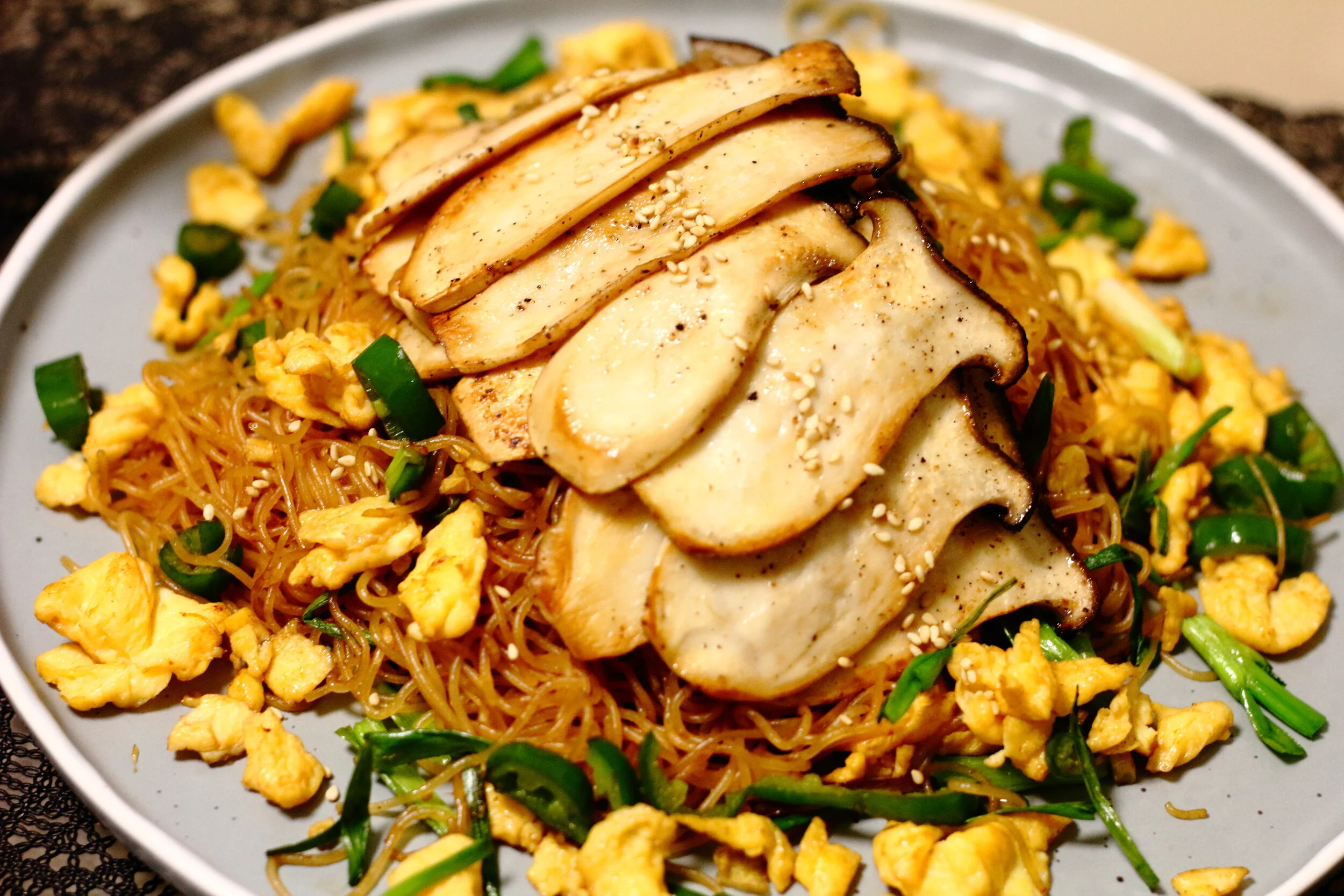 所謂港式炒米粉,就是要用豉油皇炒吧。自家做,就可以隨意一點,只用簡單的配料,雞蛋、蔥和杏鮑菇,已經香噴噴,既簡單又美味。